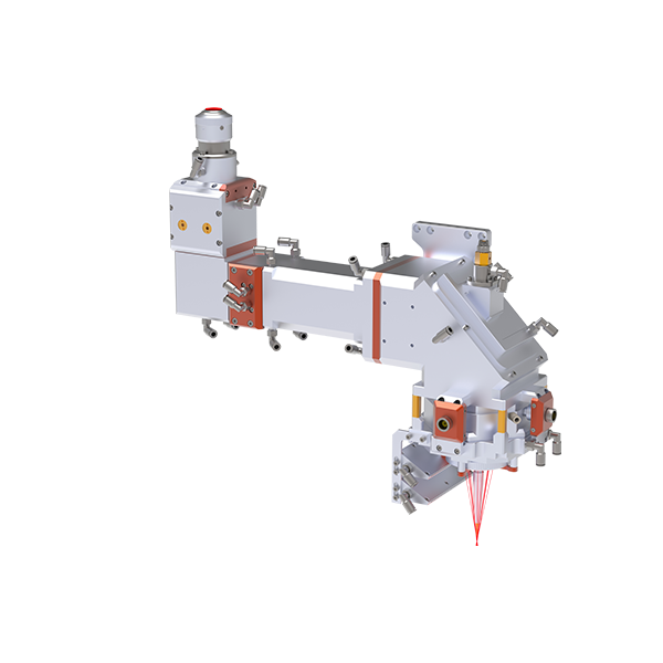 该款激光头将准直后的激光束通过两个可调距离的四面锥透镜平均分为对称的四束光束,光束经过金属离轴非球面反射镜聚焦至焦面位置。通过调节两个四面锥透镜的距离,可以实现光束内孔径的变化,实现不同尺寸的送丝,嵌入不同尺寸的送丝机构,实现高方向性精度,灵活性更高,适用场景更广泛